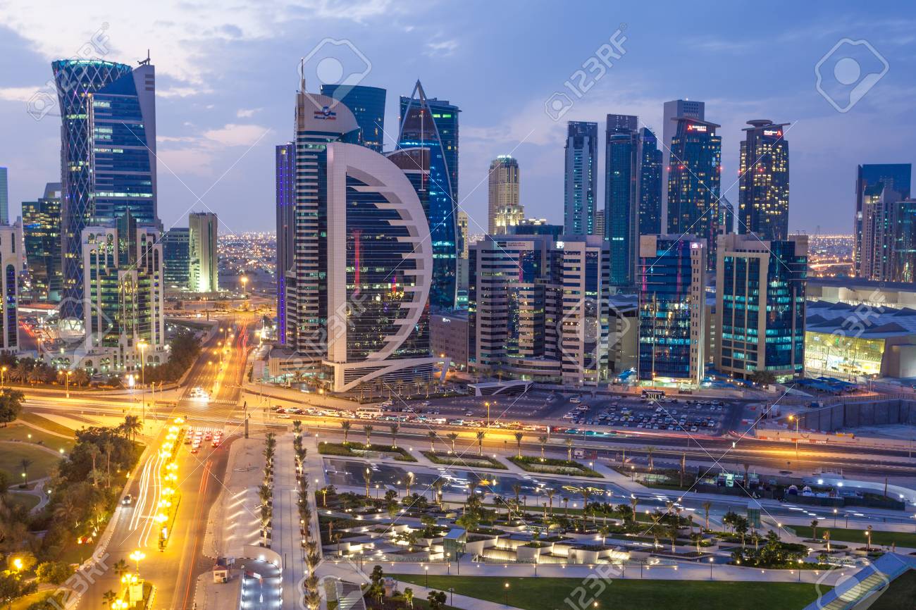 DOHA, QATAR – NOV 20: View over Doha downtown illuminated at night. November 20, 2015 in Doha, Qatar, Middle East